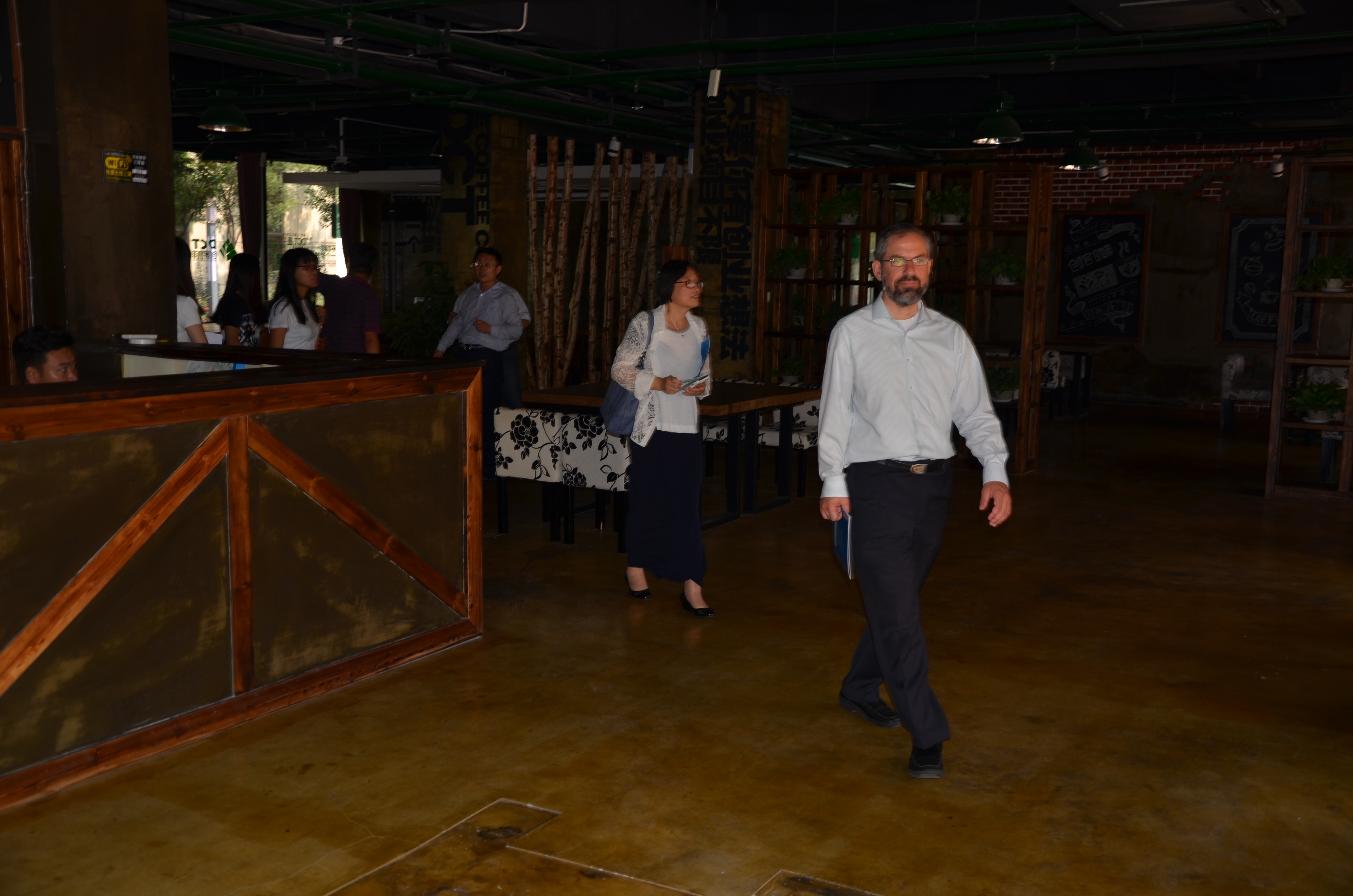 客商一行人來到園區“DCT創客空間”,邯鄲高科負責人向他們介紹了創客咖啡的結構設計理念,客商對“創客咖啡”的建造格局和發展理念表示贊賞,并學習借鑒中小企業加速器的優秀創意產業,促進自身產業的加快發展。