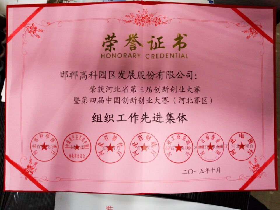 在本年度舉辦的河北省第三屆創新創業大賽暨第四屆中國創新創業大賽(河北賽區)決賽中,邯鄲高科園憑出色組織工作,榮獲大賽的“組織工作先進集體”獎。