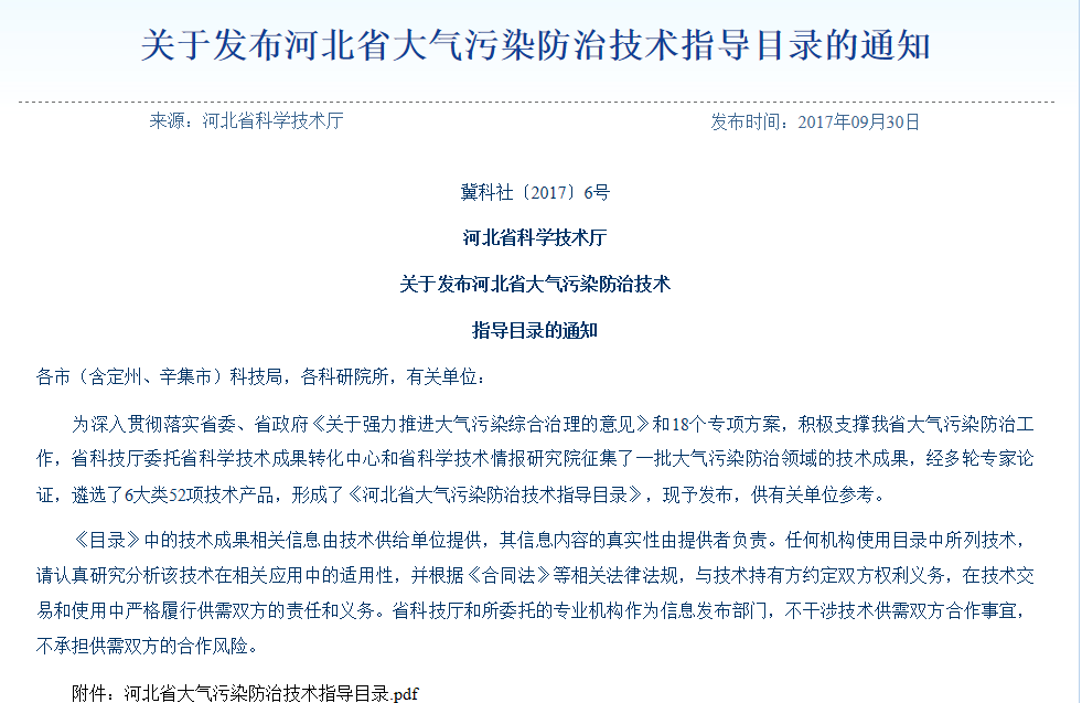 近日,河北省科學技術廳委托省科學技術成果轉化中心和省科學技術情報研究院征集了一批大氣污染防治領域的技術成果,經多輪專家論證,遴選了6大類52項技術產品,形成了《河北省大氣污染防治技術指導目錄》,園區企業河北唯沃環境工程科技有限公司榮幸入選。